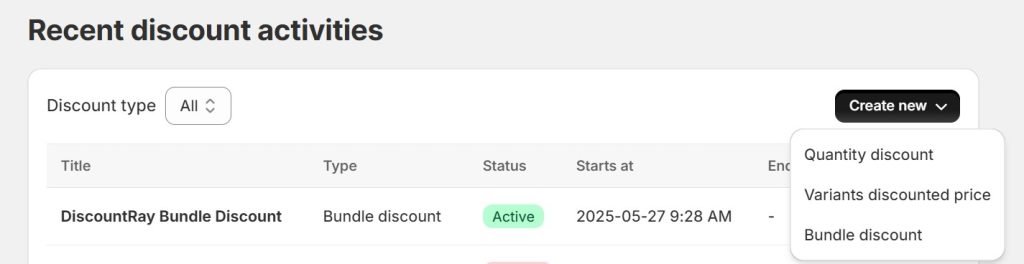 1. The “Create new” tab will help you set a new discount offer. Choose one of the three options below according to your store’s needs.