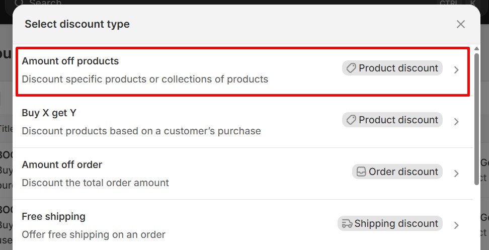 2. 「割引を作成」をクリックし、割引タイプとして「商品割引額」を選択します。